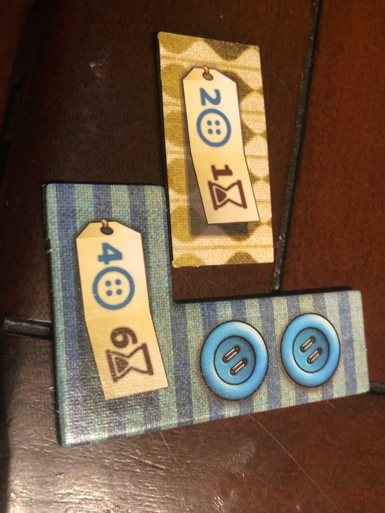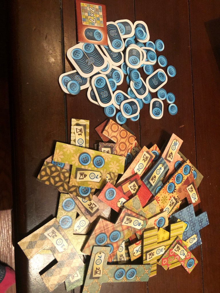 Your first experience when you get open it up is the supremely satisfying activity of punching out all the little bits and pieces from their firm cardboard. Seriously, bit-punchery is pleasing to me in a way that bubble-wrap can only aspire to. And between all the oddly shaped quilt fragments and the various buttons used as currency, there’s a lot to punch out here. Honestly–I felt a little sad when we started playing.